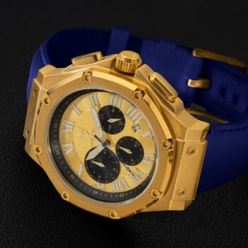 Die Ambassador in Gold aus hochwertigem 316L-Edelstahl, mit schwarzem Lederarmband und japanischem Seiko-Uhrwerk mit Zeit, Datum, Stoppuhr und 24-Stunden-Funktion. Diese stilvolle Uhr passt perfekt zu allen Outfits, sowohl zu lässigen als auch zu formellen.