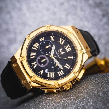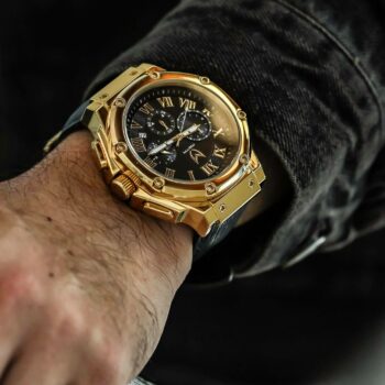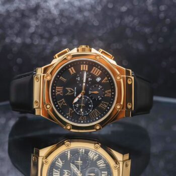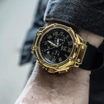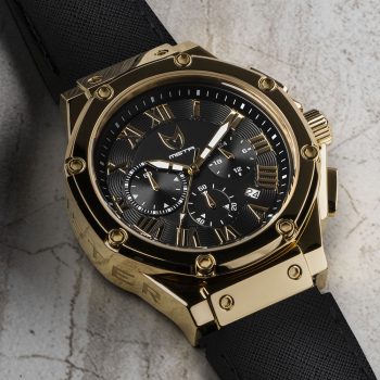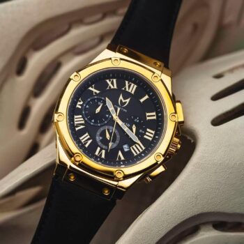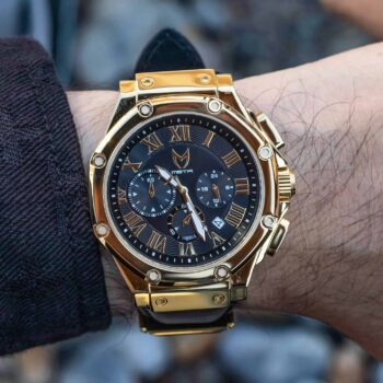 Die Ambassador in Polished Gold & Schwarz aus hochwertigem 316L-Edelstahl, mit schwarzem Lederarmband und japanischem Seiko-Uhrwerk mit Zeit, Datum, Stoppuhr und 24-Stunden-Funktion. Diese stilvolle Uhr passt perfekt zu allen Outfits, sowohl zu lässigen als auch zu formellen.
