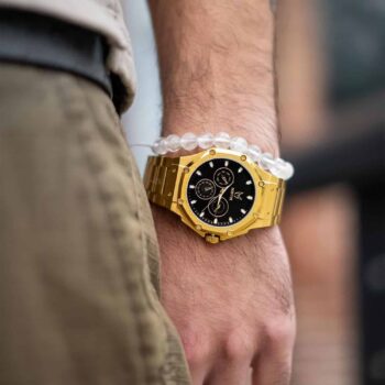 Die Ambassador Slim Herrenuhr in Gold – Diese Uhr ist aus feinstem 316L-Edelstahl gefertigt, hat ein Edelstahlband mit abnehmbaren Gliedern und eine Schmetterlingsschließe. Die Uhr hat eine gebürstete Oberfläche auf dem Gehäuse und dem Band. Dieses Modell wird von einem japanischen Quarzwerk von Seiko mit Zeit-, Datums- und Tagesfunktion angetrieben. Das Zifferblatt ist schwarz und hat goldene Akzente. Die Stundenmarkierungen und Zeiger sind leicht reflektierend. Die Ambassador Slim ist eine kompakte und robuste Herrenuhr mit einem Durchmesser von 41 mm und einer Dicke von 8 mm. Die Ambassador Slim ist außerdem bis zu 100 Meter wasserdicht, sodass Schwimmen mit der Uhr kein Problem ist. Mit der verlängerten 2-Jahres-Garantie kannst du dir außerdem sicher sein, dass du eine hochwertige Uhr bekommst, an der du lange Zeit Freude haben wirst.