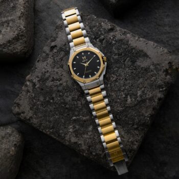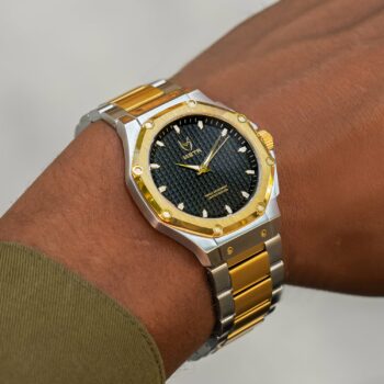 Die Ambassador Slim Herrenuhr in Silver & Gold – Diese Uhr ist aus feinstem 316L-Edelstahl gefertigt, hat ein Edelstahlband mit abnehmbaren Gliedern und eine Schmetterlingsschließe. Die Uhr hat eine gebürstete Oberfläche auf dem Gehäuse und dem Band. Dieses Modell wird von einem Schweizer Quarzwerk von Ronda. Das Zifferblatt ist schwarz und hat goldene Akzente. Die Stundenmarkierungen und Zeiger sind leicht reflektierend. Die Ambassador Slim ist eine kompakte und robuste Herrenuhr mit einem Durchmesser von 41 mm und einer Dicke von 8 mm. Die Ambassador Slim ist außerdem bis zu 100 Meter wasserdicht, sodass Schwimmen mit der Uhr kein Problem ist. Mit der verlängerten 2-Jahres-Garantie kannst du dir außerdem sicher sein, dass du eine hochwertige Uhr bekommst, an der du lange Zeit Freude haben wirst.