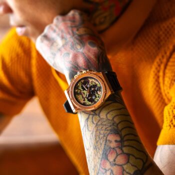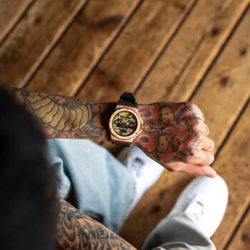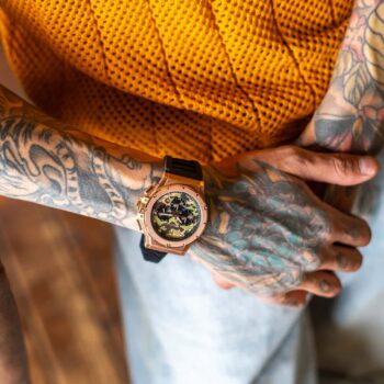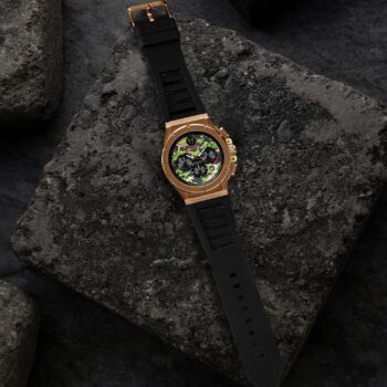 Als Teil unserer neuen MKV-Kollektion haben wir diese silberne Camo-Uhr entworfen! Das mehrfarbige Camo-Zifferblatt, das silberne Gehäuse, der grüne Gehäuseeinsatz und das schwarze Kautschukarmband sind das neueste Modell der MKV-Kollektion. Das silberne Gehäuse hat ein individuelles Camo-Zifferblatt, glänzende schwarze Stunden- und Minutenzeiger sowie schwarze Hilfszifferblätter mit goldenen Akzenten um die Stundenmarkierungen. Die Uhr wird mit einem schwarzen Vollgummiarmband mit atmungsaktiven Kiemen geliefert. Diese sorgen für Luftstrom und Zirkulation, so dass das Armband am Handgelenk besser atmet. Diese Uhr und ihr roségoldenes Pendant sind einmalig und nur in begrenzter Stückzahl erhältlich.